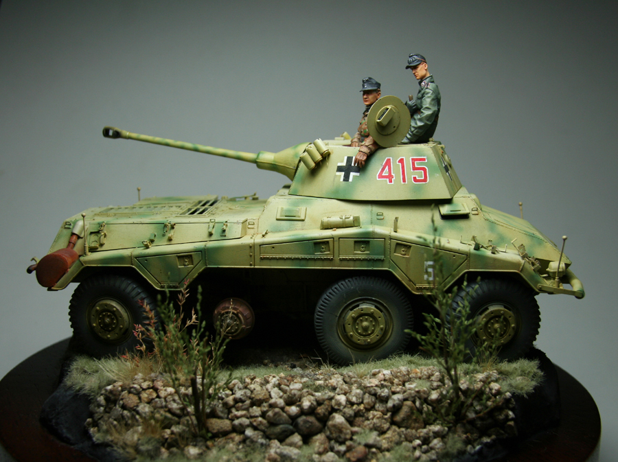 PUMA:Sd. Kfz231の後継として開発された本車には砂漠戦(熱と砂との戦い)の教訓を生かしタトラ社製103型V12空冷式ディーゼルエンジンが搭載されていました。外観はより洗練されたスタイルになり、武装には当初計画されていた威力偵察用2cm機関砲ではなく、多少の対戦車能力を有したラインメタル社製60口径5cmkwK39/1及びMG42同軸機銃を完全密閉式の砲塔に装備していました。リーフスプリング式独立懸架の8輪駆動、8輪操向で前後に二つの操縦席まで備えたその凝った作りは車愛好家の夢であっても整備兵の悪夢でしょうし、大量生産に向かないその構造は戦術的にみて優れた兵器であったかも疑問です。しかしこれらの先進的な技術投入により本車は前身である6輪装甲車のそれに対して大幅な性能アップを遂げていました。また模型的観点からもこれらの特徴は当然魅力的であり、今回の作例でも出来る範囲でその独特の個性を実感していただけるような設定に工夫しました。