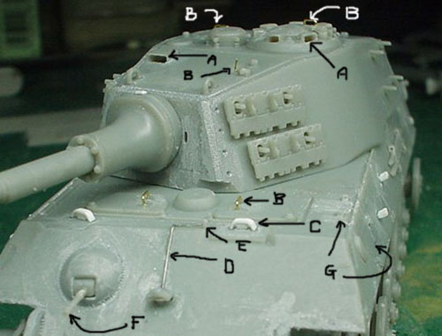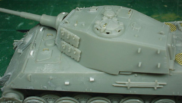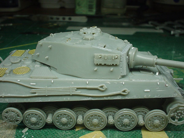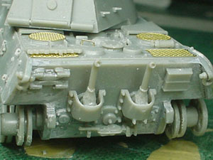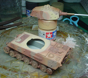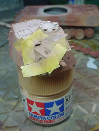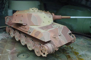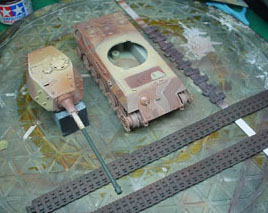 ![]() ![]() と、全体的にはこんな感じになりました。(しかし派手だ!)キャタピラはレッドブラウンで塗装。その後ジャーマングレイでレッドブラウンが多少残るような感じでオーバースプレーをしています。また転輪が擦れる部分には少々グリーンを混ぜたジャーマングレイをその後帯状に吹いています。 |
