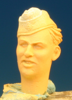 右: 口の内部、唇の付け根周辺をVA940サドルブラウンで塗装。その後、歯をホワイト+極少量ベーシックスキントーンで塗装。各部の塗料が乾燥して落ち着いてきたら、極薄VA(ヴァレフォ)815ベーシックスキントーンで部分的にフィルタリングを行う。その後極薄VA876ブラウンサンドで暗部とその境目のグラデーションを緩和していく。この作業を気になる各部に繰り返して行う。この後、唇全体にピンク系を使用、髪の毛のハイライト(VAダークイ一ロー)。最凸部には薄く溶いたVAホワイトを直接使用している。 |
