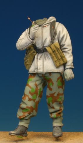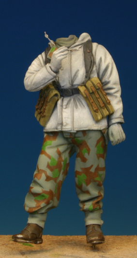 左画像 影をさらに入れていく。画像ではわかりにくいが、上着のいわゆる白い部分は一部の凸部以外はすべて(薄い塗料ではあるが)グレイで塗装が施されている。グレイと白の境目のグラデーションが自然になるように何度も塗装を行う。