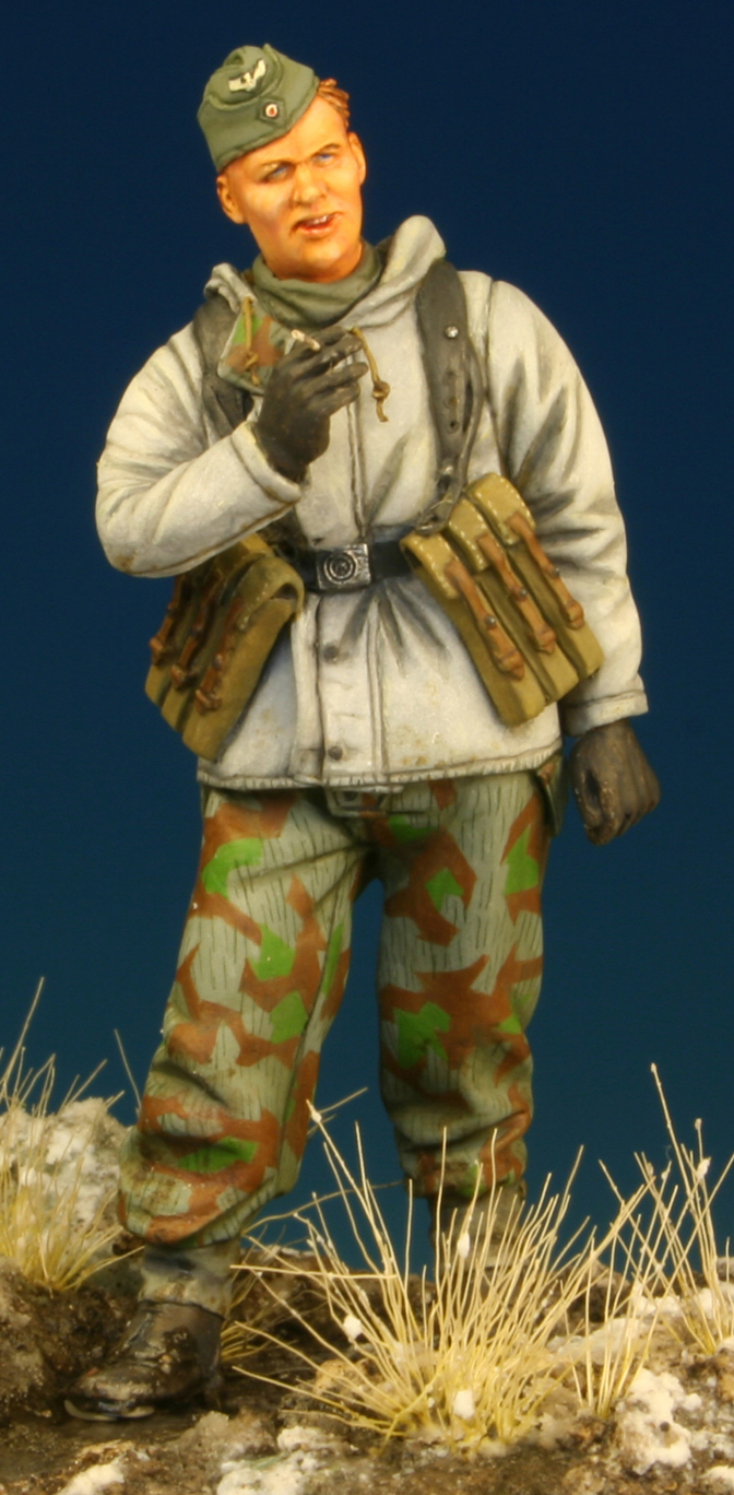 顔の部分は特に一度完全に乾燥させてから、ベースになる基本色、と茶系を微量混ぜたもので数回ワッシングする。よりグラデーションを自然な風合いにするためにこれは重要。時間が無い場合は辛いですけど・・・。しかし、塗料が完全に乾くには3日程度かかるので、理想的には少なくとも一度塗り終わったものを3日後にまた細部の状態や色調を中心に確認する必要があると思います。これによりイメージした仕上がりにより近づけることが可能になるはずです。 |